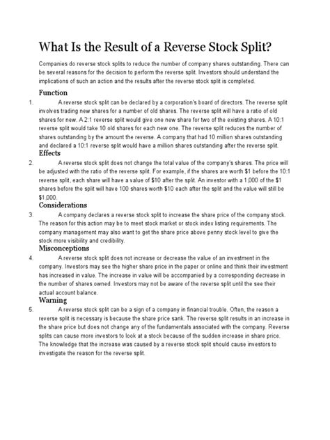 Alright, so you’re holding BEKS stock, and the news of a reverse stock split hits. How does a BEKS reverse stock split affect your shares ? Let’s break it down. As we touched upon earlier, the most immediate effect is a reduction in the number of shares you own. If BEKS enacts a 1-for-10 reverse split, and you currently own 1,000 shares, you’ll end up with 100 shares. Simple enough, right? Now, what about the value? In theory, the total value of your investment should remain the same immediately after the split. So, if your 1,000 shares were trading at \(0.50 each (totaling \) 500), your new 100 shares would theoretically trade at \(5.00 each (also totaling \) 500). This is the ideal scenario, where the market price adjusts proportionally to the reduction in shares. However, the stock market is rarely that neat and tidy. The real impact on the value of your holdings often depends on market sentiment and the company’s underlying performance. While the split itself doesn’t create or destroy value, the reason for the split and how the market perceives it can significantly influence the stock’s future performance. If the market sees the reverse split as a sign that the company is taking necessary steps to improve its situation and regain compliance, the stock price might stabilize or even increase post-split. Conversely, if investors view the split as a desperate measure by a struggling company with no fundamental improvement, the stock price could continue to decline, even with the higher per-share price. Another crucial point is fractional shares. What happens if, after the split, you’re left with a fraction of a share? For example, if you owned 55 shares and there’s a 1-for-10 split, you’d end up with 5.5 shares. Companies usually handle fractional shares by either rounding them up to the nearest whole share or, more commonly, cashing them out at the current market price. This means you might receive a small cash payment for that fractional part. It’s essential to check BEKS’s specific policy on handling fractional shares. So, while the number of shares decreases and the price per share increases, the ultimate impact on your portfolio’s value is a dynamic outcome influenced by market reactions and the company’s future prospects. It’s not just about the mechanics; it’s about the market’s interpretation of these mechanics.