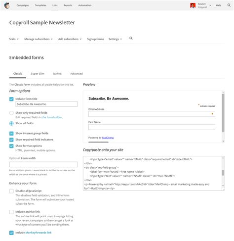 If you used Mailchimp’s own signup form generator (Method 2), you have some basic styling options right within Mailchimp. When you’re creating or editing your embedded form, look for styling options. You can often choose colors, fonts (limited choices), and layouts. It’s not drag-and-drop design, but it allows you to make the form somewhat align with your brand. You can select a “Classic” form and choose from a few different styles or “update to the latest” for more modern options. Remember, the goal here is to make it less generic.