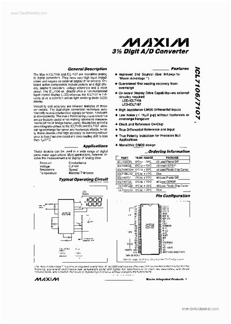 The electrical characteristics section of the ICL7107CPL datasheet provides detailed information about the chip’s performance under various operating conditions. This section includes parameters such as input bias current, input offset voltage, common-mode rejection ratio (CMRR), and power supply rejection ratio (PSRR). Understanding these characteristics is essential for designing circuits that meet specific performance requirements.