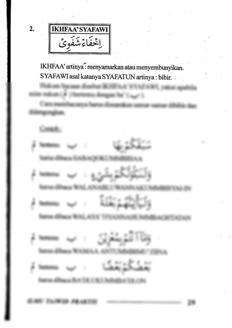 So, what exactly is Ikhfa Syafawi ? Let’s break it down bit by bit. In Tajwid, Ikhfa generally means to conceal or to hide something. Syafawi , on the other hand, relates to the lips. So, when you put it all together, Ikhfa Syafawi refers to concealing a sound that originates from the lips. Specifically, it happens when the “meem” sakinah (مْ), which is a “meem” with a sukun (a little circle indicating no vowel sound), is followed by the letter “baa” (ب). When this occurs, you don’t pronounce the “meem” clearly. Instead, you kind of hide it or blend it into the “baa” . This creates a distinct sound that’s softer than a clear pronunciation of the “meem” . It’s like you’re gently transitioning from the “meem” to the “baa” without a hard stop or a distinct separation. This rule is crucial in Tajwid because it maintains the flow and melody of the Quranic recitation. It prevents any abrupt or harsh sounds, ensuring the recitation remains smooth and pleasing to the ear. Understanding Ikhfa Syafawi is not just about knowing the rule; it’s about appreciating the beauty and precision of Tajwid. It’s about recognizing how each rule contributes to the overall aesthetic and spiritual experience of reciting the Quran. Think of it like this: each Tajwid rule is a brushstroke in a beautiful painting, and Ikhfa Syafawi is just one of those strokes that adds depth and texture to the artwork. So, next time you come across a “meem” sakinah followed by a “baa” , remember Ikhfa Syafawi and let your recitation flow with grace and beauty.
