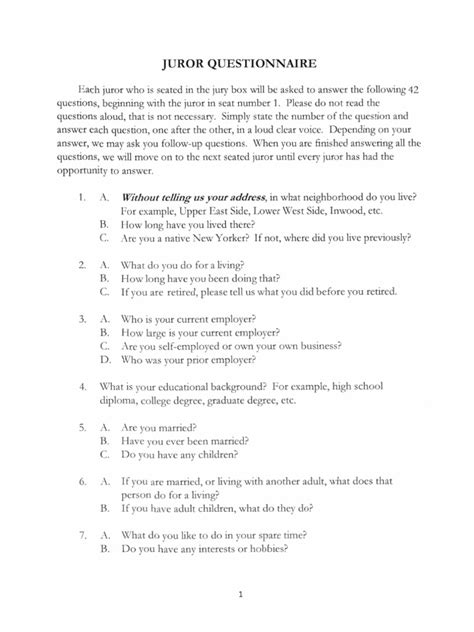 The juror questionnaire serves as an initial screening tool. The court uses it to gather basic information about potential jurors, such as their background, qualifications, and any potential biases. Think of it as the court getting to know you a little before potentially asking you to serve on a jury. The questions are carefully crafted to identify individuals who meet the legal requirements for jury service and who can approach a case with an open mind. This process helps ensure that the jury is composed of individuals who can fairly and impartially assess the evidence and apply the law.