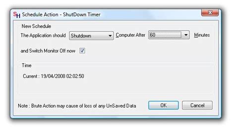 3. Set the Timer: Choose the action you want to perform (shutdown, restart, etc.) and set the timer using the hours and minutes fields.
