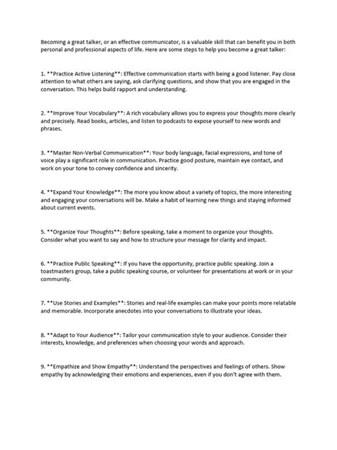 Active Listening : This isn’t just about hearing; it’s about understanding and responding thoughtfully. It involves paying attention to the speaker, asking clarifying questions, and showing empathy. Think about the most engaging conversations you’ve had. Chances are, the other person was an active listener, making you feel heard and valued. Empathy is a huge component of active listening. Put yourself in the other person’s shoes, try to see their perspective, and show that you understand their feelings and experiences. TED speakers often use this approach to build connections with their audience, sharing stories that resonate on a deeper level. Active listening isn’t just a skill for one-on-one conversations. It is crucial for group interactions, and is critical to negotiation and conflict resolution. By actively listening, you are able to understand the needs, concerns, and interests of the other parties involved, which allows you to build stronger relationships.