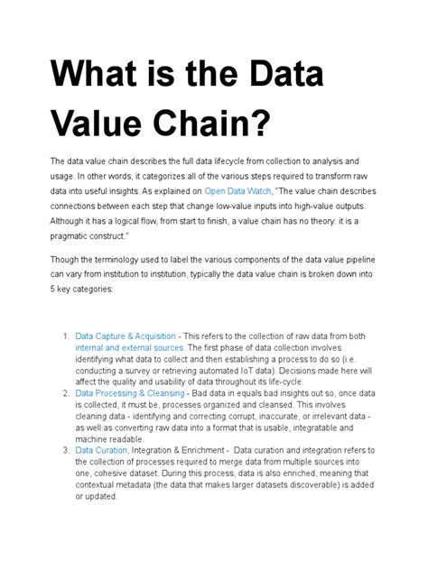 So, what is the data value chain meaning ? Essentially, it’s a series of interconnected stages that data goes through, from its initial creation or capture all the way to its ultimate utilization and the value it delivers. Imagine it like an assembly line, but for information. Each step adds something to the data, refining it, organizing it, and making it more useful. This chain isn’t a one-off event; it’s a continuous process. Companies that master their data value chain are the ones that really thrive in today’s data-driven economy. They don’t just sit on heaps of information; they actively work it, polish it, and turn it into actionable insights. This entire process transforms raw data, which by itself might not be very useful, into a strategic asset. It’s about maximizing the potential of every piece of information your organization possesses. We’re talking about turning those digital breadcrumbs into a roadmap for success. The beauty of understanding this chain is that it allows you to identify bottlenecks, optimize processes, and ensure that you’re getting the most bang for your buck from your data investments. It’s a fundamental concept for anyone looking to leverage data effectively.