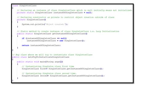 In this example, the constructor is private, preventing direct instantiation. The getInstance method provides a global access point to the singleton instance. The first time getInstance is called, it creates a new instance of the Singleton class. Subsequent calls simply return the existing instance. This ensures that only one instance of the class is ever created.