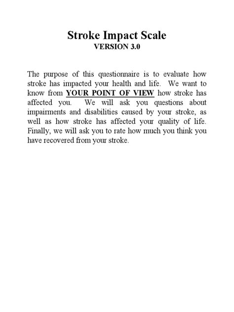 So there you have it, guys! The Stroke Impact Scale is far more than just a questionnaire; it’s a vital instrument that provides a comprehensive and patient-centered way to understand the profound impact of a stroke. By breaking down recovery into eight key domains – strength, hand dexterity, ADLs, IADLs, memory, emotions, communication, and social participation – the SIS offers invaluable insights for both individuals and healthcare professionals. It empowers survivors by giving them a voice in their own assessment and recovery, helping to tailor rehabilitation plans that address the unique challenges they face. It allows for the crucial tracking of progress over time, ensuring that interventions remain effective and adaptable. Furthermore, the data gathered from the SIS fuels important research, leading to better understanding and improved treatments for future stroke survivors. Whether used in clinical settings to guide therapy, in research to evaluate new approaches, or by individuals to set goals, the SIS underscores the multifaceted nature of stroke recovery . It reminds us that true recovery isn’t just about regaining physical function, but about restoring quality of life in its entirety. It’s a powerful tool that truly honors the survivor’s journey and supports their path towards regaining independence and well-being. Keep advocating for your recovery, and remember that tools like the SIS are there to help guide and measure that incredible progress!