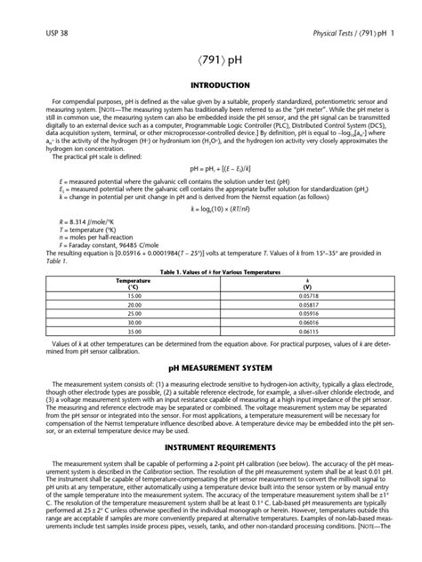 • Procedures: The chapter outlines the steps you should take when measuring pH. This includes preparing your samples, using the meter correctly, and recording your results accurately. USP 791 gives detailed instructions on how to measure the pH of different types of samples, including solutions, suspensions, and solids. Following these procedures will help ensure consistency and accuracy.